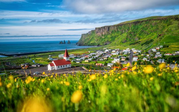 Vik village: Enjoy a stop at Iceland’s southernmost village, surrounded by beautiful and impressive high bird cliffs. The black volcanic sand beach south of Vík is ideal for viewing the spectacular rock formations Dyrhólaey and Reynisdrangar.